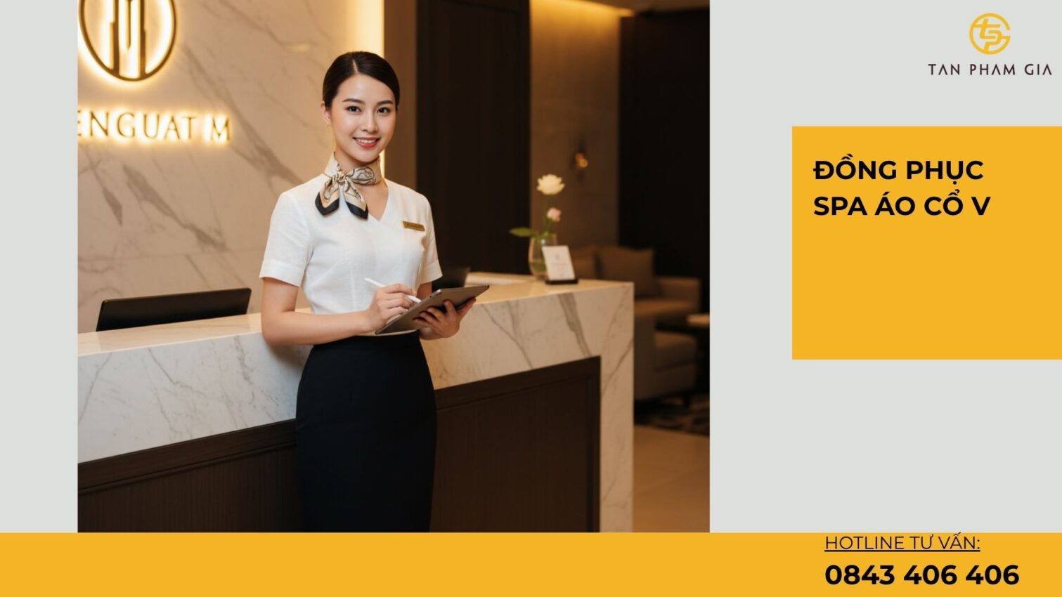 Áo cổ V lễ tân thường được may bằng màu sắc đồng bộ với nội thất và logo spa để tạo sự nhận diện thương hiệu. Ví dụ: spa phong cách thiên nhiên chọn xanh lá, be; spa hiện đại chọn trắng, đen hoặc navy.