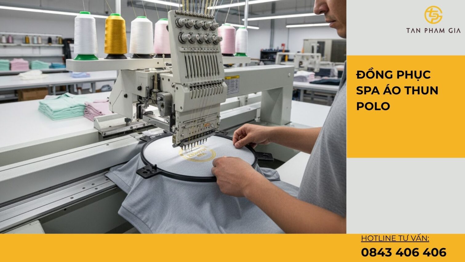Logo spa nên được thêu kích thước nhỏ 5–7 cm ở ngực trái, vừa dễ nhận diện vừa không làm mất sự cân đối tổng thể.