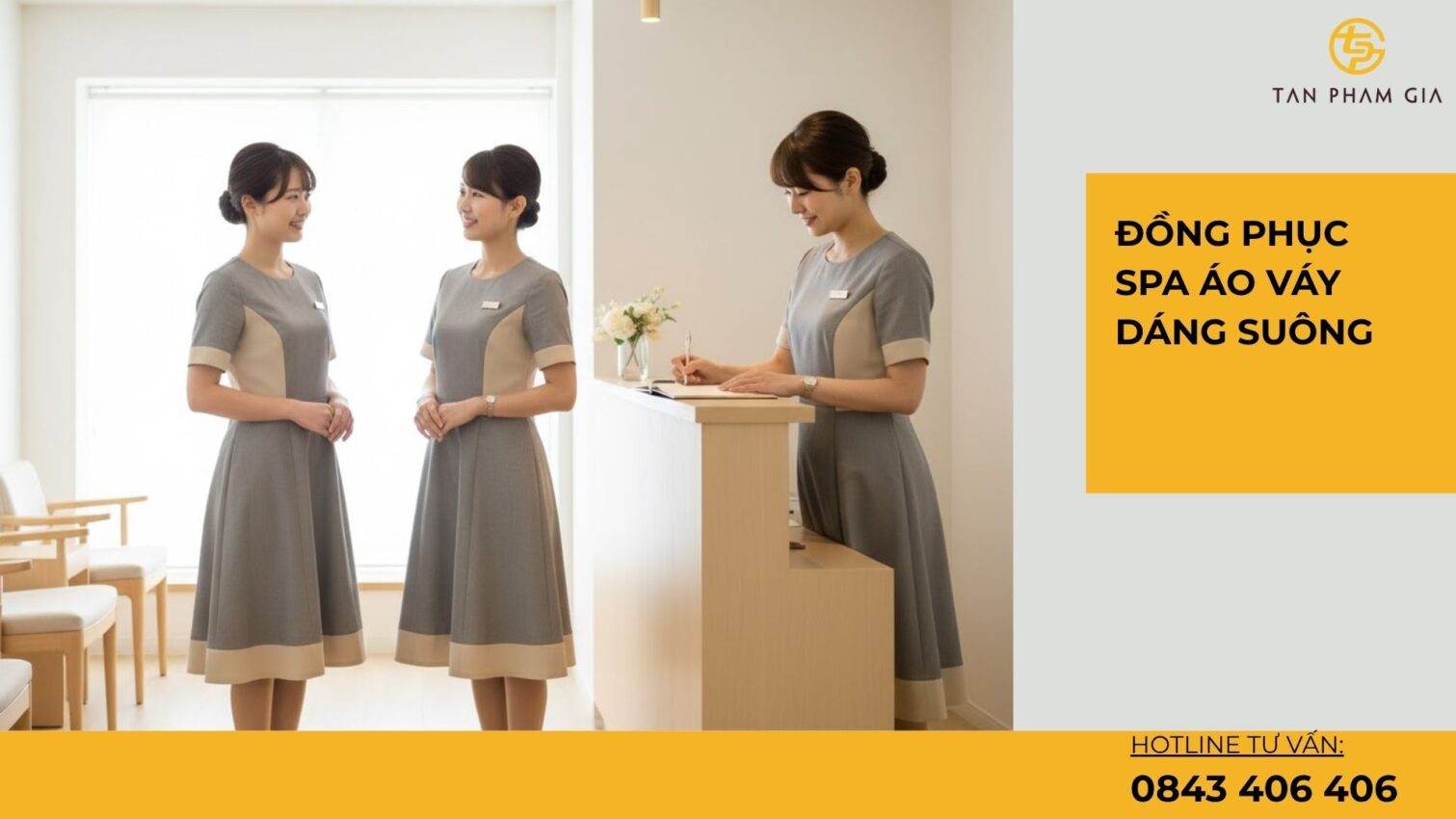 💬 Mẹo nhỏ: Spa có thể phân biệt màu váy hoặc phụ kiện giữa từng bộ phận (ví dụ: lễ tân màu kem, kỹ thuật viên màu nâu nhạt) để vừa đồng bộ, vừa dễ nhận diện chức năng.