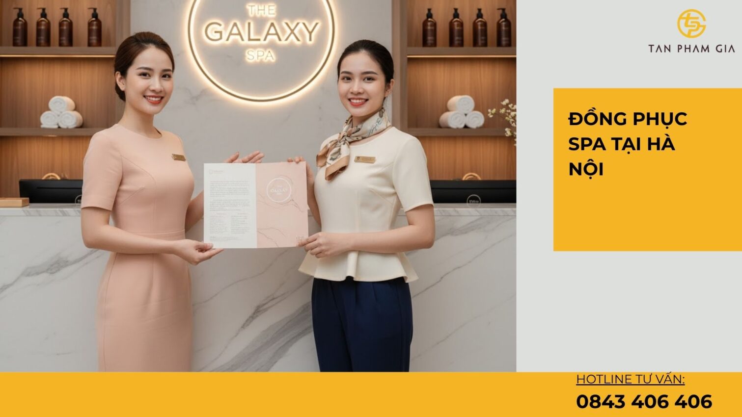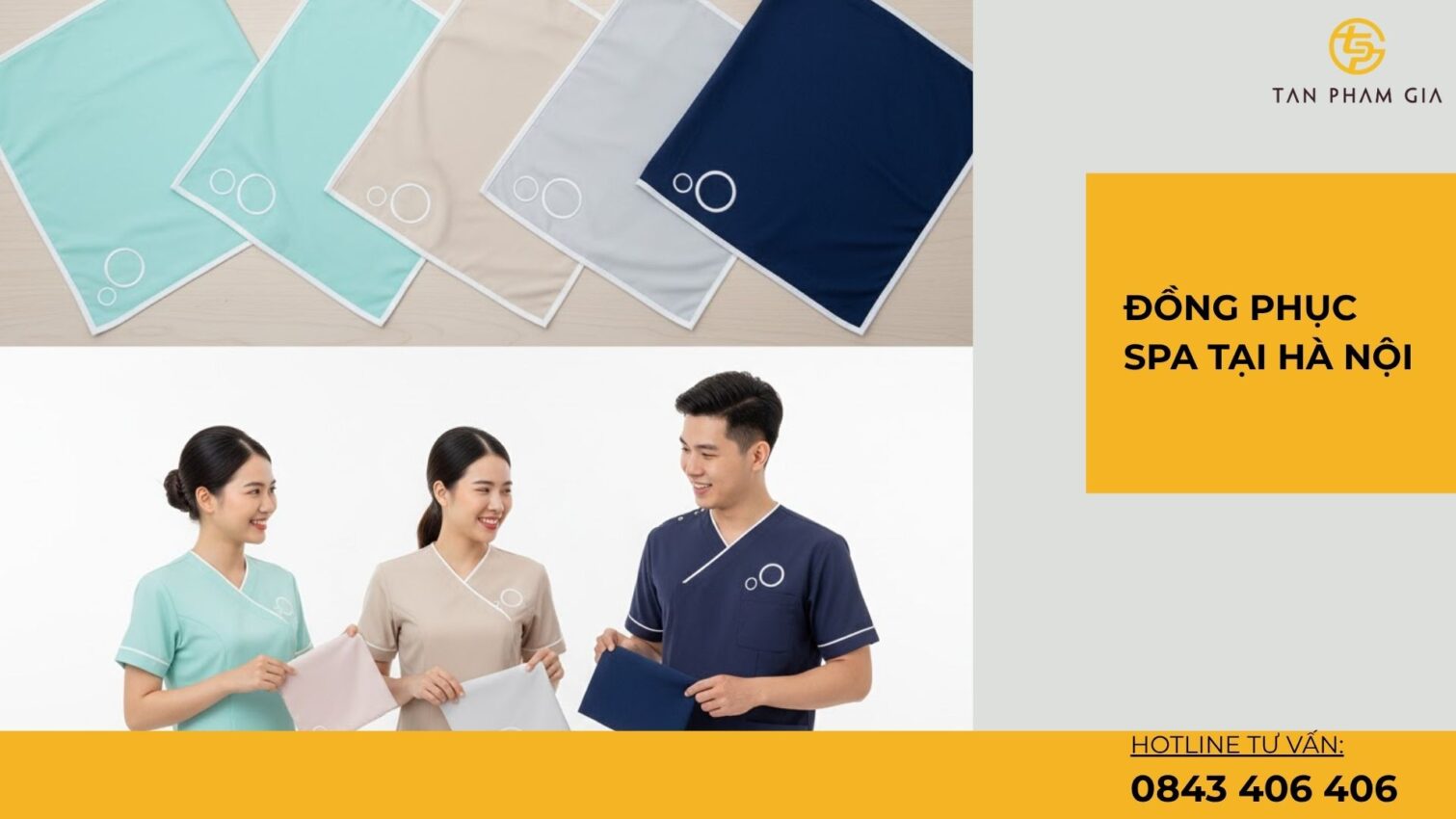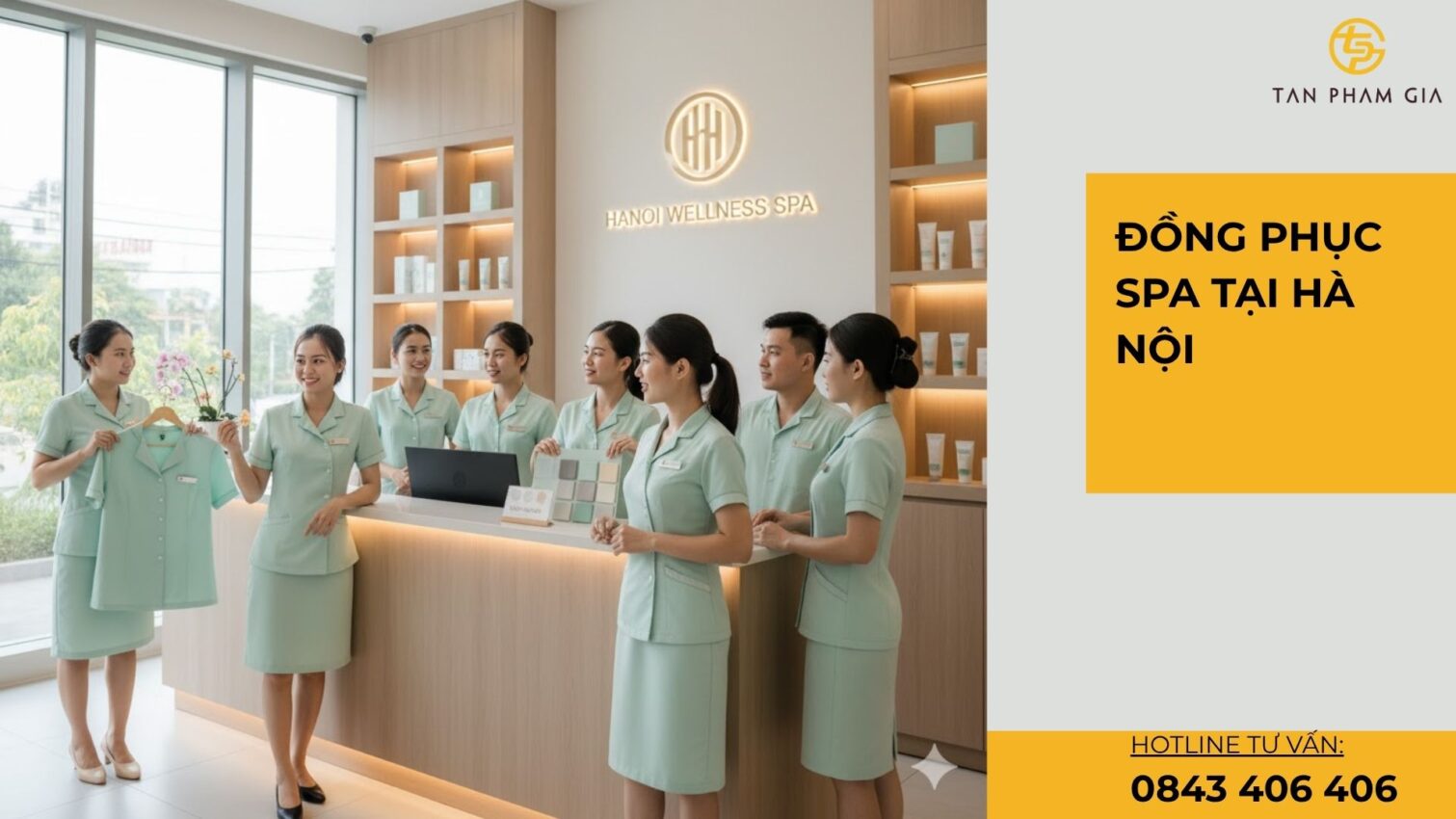Bối cảnh: spa phố cổ mặt tiền nhỏ, khách du lịch nhiều. Giải pháp: đồng phục lễ tân be + line trắng, KTV mint pastel, quản lý navy. <u>Logo thêu</u> 5.5 cm ngực trái, khăn lụa tông be cho lễ tân. Kết quả: ảnh POS sáng – sạch, điểm hài lòng tăng. 📈