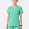 Form đồng phục được cắt may theo dáng nữ chuẩn, với cổ chữ V mềm mại, tay ngắn liền thân, eo ôm vừa đủ tạo sự gọn gàng, nhẹ nhàng. Quần suông thẳng có lưng thun co giãn, vừa đảm bảo tính thẩm mỹ vừa dễ dàng vận động trong suốt ca làm việc.