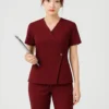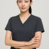 Form đồng phục dành riêng cho nữ, được cắt may gọn gàng với cổ áo chữ V nhẹ nhàng, phần eo ôm vừa phải, tay ngắn liền thân, tạo cảm giác thoải mái và thanh lịch. Dáng áo suông mềm mại vừa đủ che khuyết điểm, vừa dễ vận động.