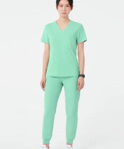 Đồng phục được thiết kế với cổ chữ V nhẹ nhàng, tay ngắn và phần eo được may vừa vặn, tạo form suông gọn gàng nhưng không ôm sát, giúp người mặc dễ dàng di chuyển và thực hiện thao tác chuyên môn. Quần lưng thun co giãn, ống đứng nhẹ, thuận tiện trong môi trường phải vận động liên tục.