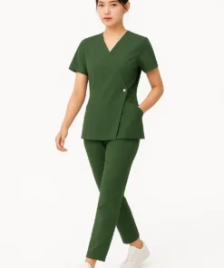 Mẫu đồng phục sở hữu thiết kế cổ chữ V, tay ngắn liền thân, giúp tạo vẻ thanh lịch mà vẫn đảm bảo tiện lợi cho các thao tác chuyên môn. Phần thân áo được may nhẹ ôm eo, kết hợp quần lưng thun co giãn, mang lại cảm giác thoải mái – dễ di chuyển – linh hoạt cả ngày dài. Màu vải xanh rêu được chọn lọc kỹ lưỡng để tạo ấn tượng điềm đạm nhưng không đơn điệu.